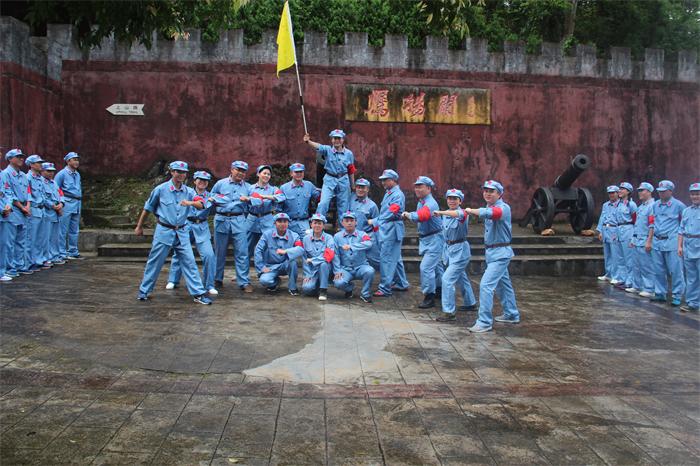 在紅七軍廣場,我們開展了拓展培訓比武。四個縱隊分別選出自己的隊長和政委,在規(guī)定的時間內確定隊名、隊徽、口號、隊形并進行操練。經(jīng)過一番謀劃,雄鷹隊、陽光隊、飛鷹隊、鐵軍隊騰空出世。接下來便是登場亮相,首先上場的是鐵軍隊,在一番隊形變換后,喊出了“城投鐵軍,永奪冠軍”的口號震撼大地。