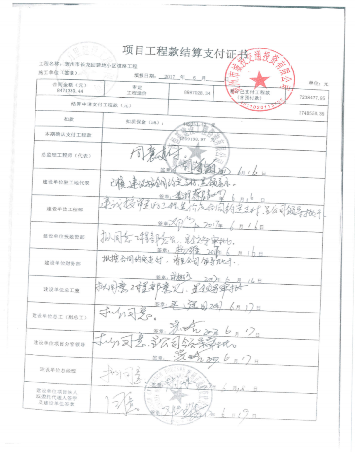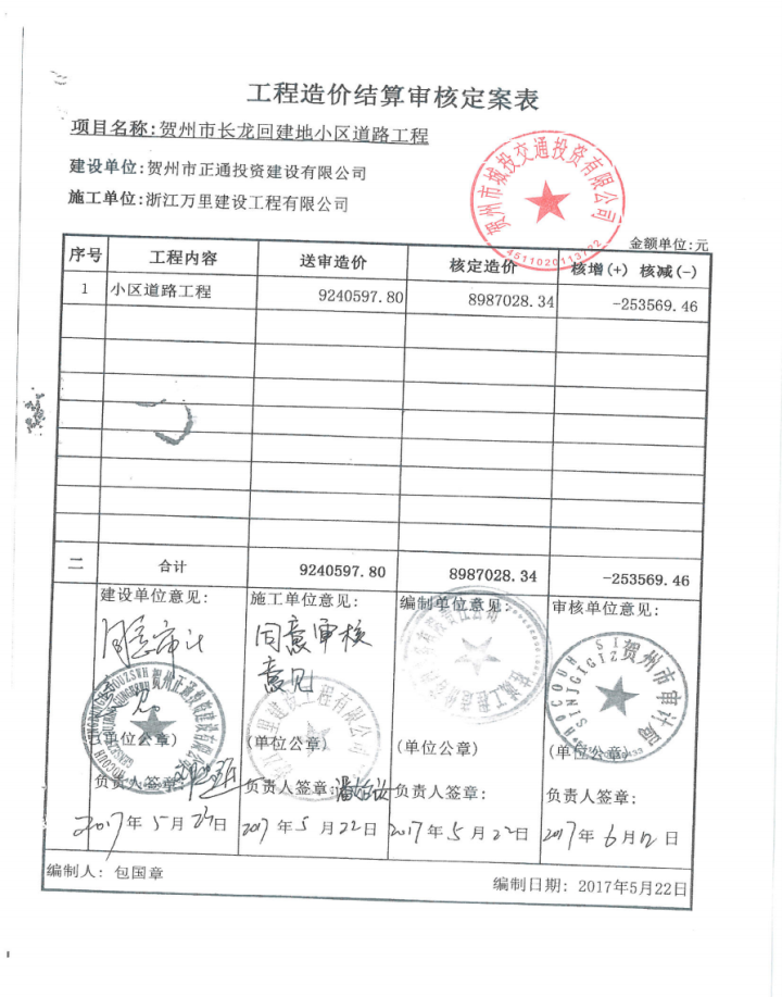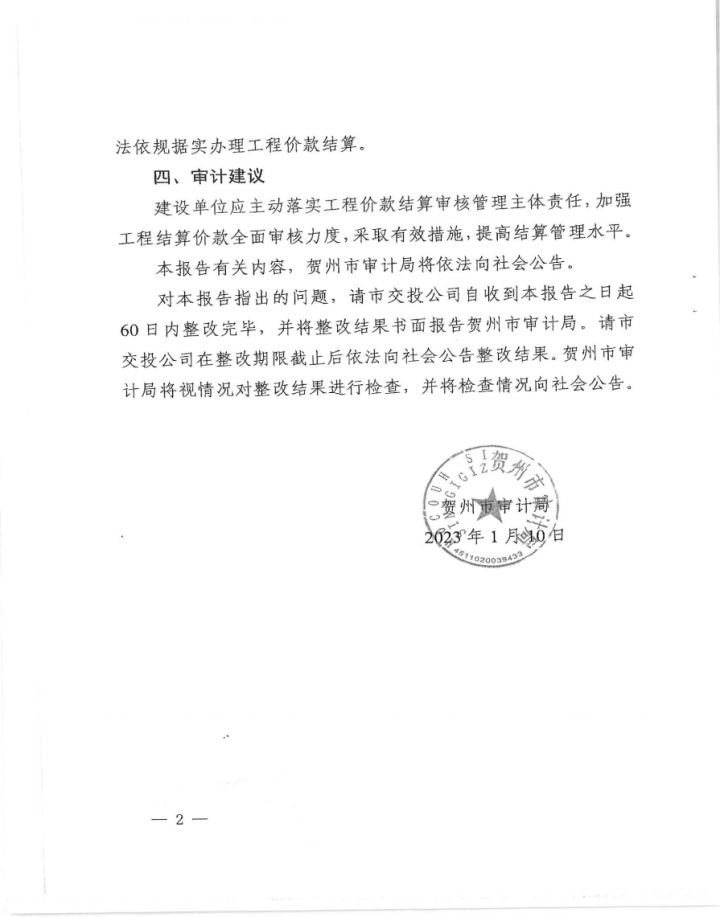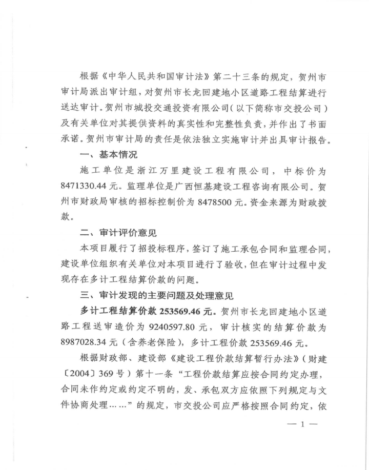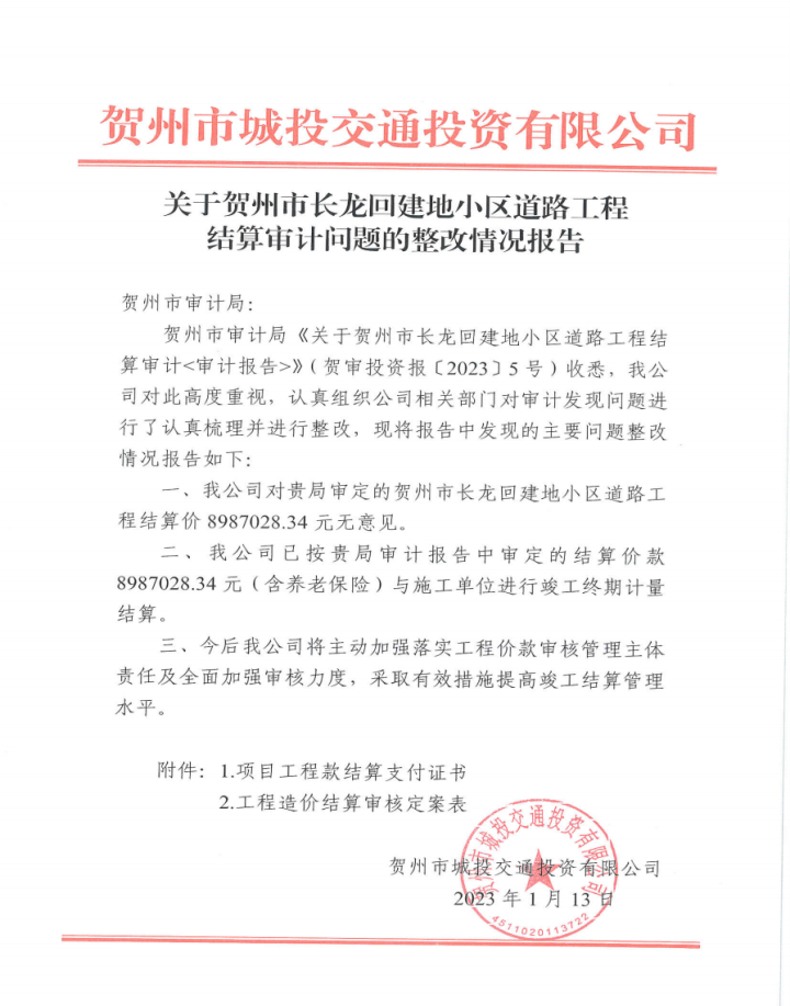 城投集團(tuán)關(guān)于賀州市長龍回建地小區(qū)道路工程結(jié)算審計整改情況報告公示