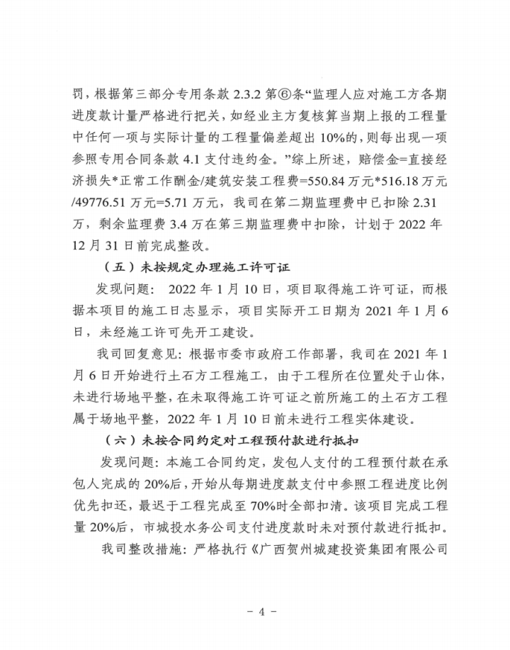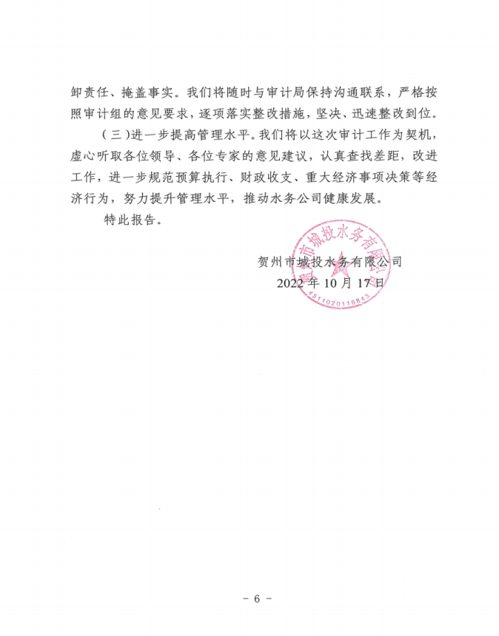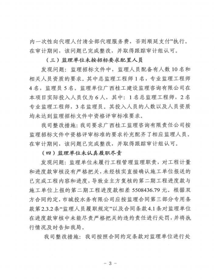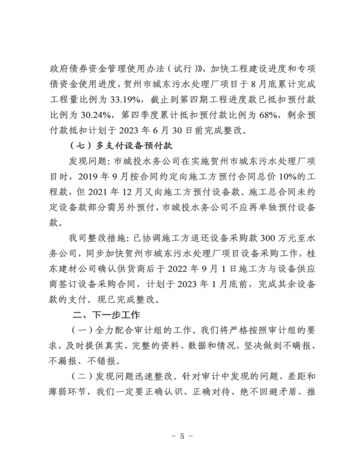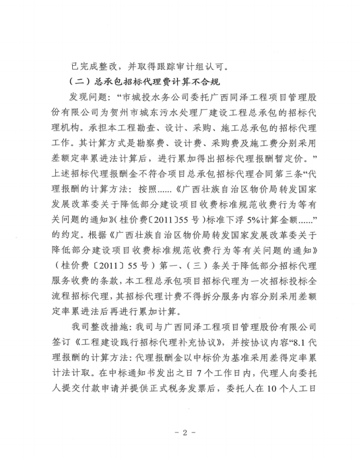 賀州市城投水務(wù)公司關(guān)于賀州市城東污水處理廠建設(shè)工程跟蹤審計發(fā)現(xiàn)問題整改情況的報告