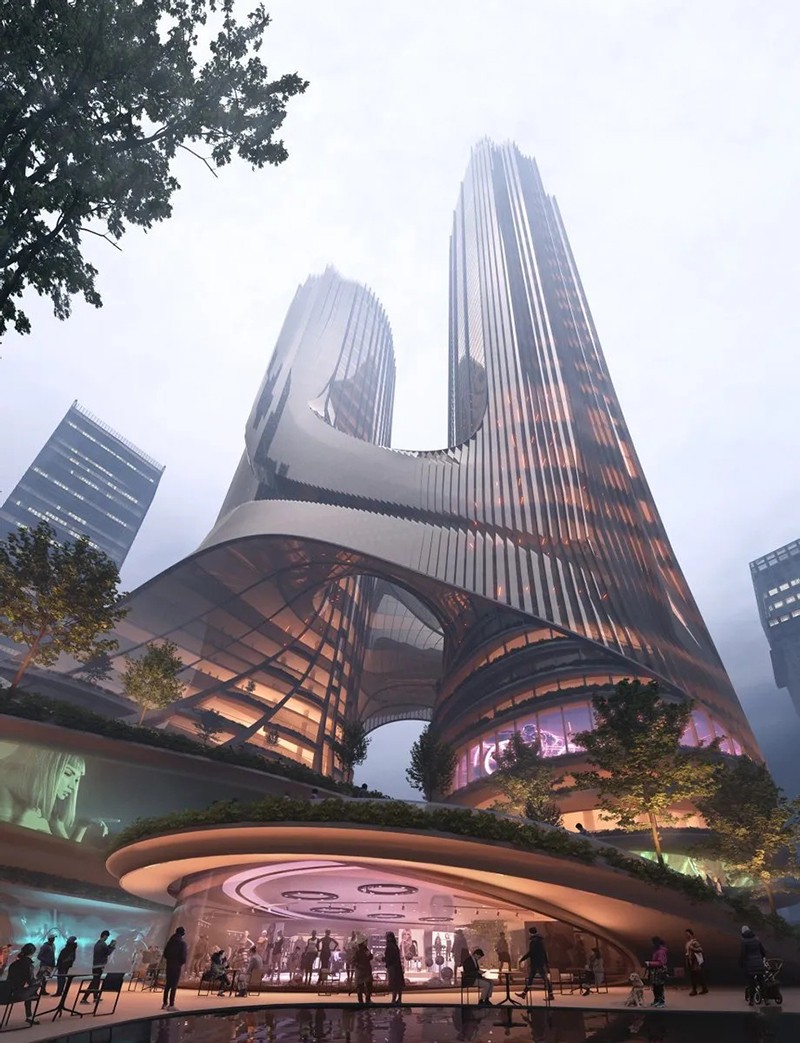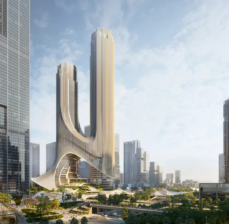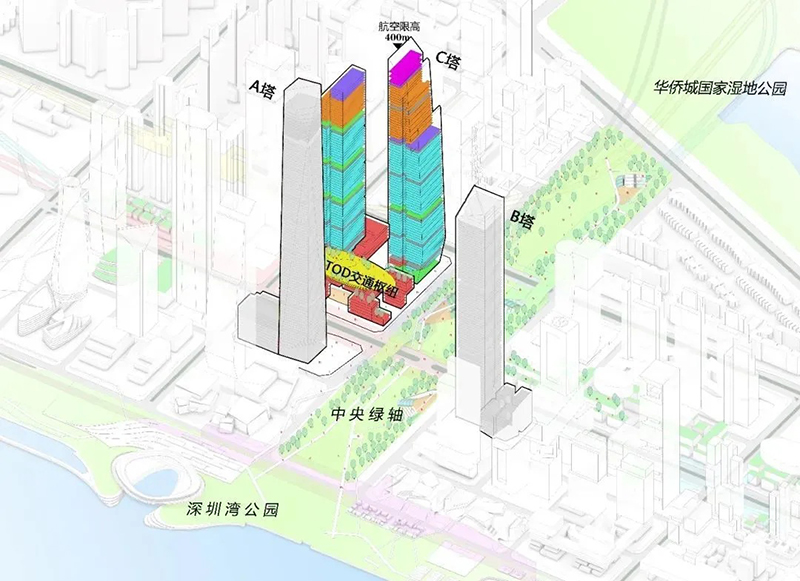 C塔被稱為“未來之塔”,位于深圳市南山區(qū)深圳灣超級總部基地的“十字雙軸”中心,總投資約165億元,占地面積3.6萬平方米,由高約395米和300米的兩座摩天樓共同組成的一座多維度“垂直都市”,呈“雙人起舞”的形體。