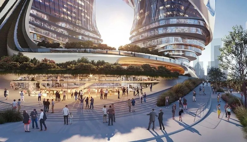 扎哈事務(wù)所的設(shè)計旨在創(chuàng)造一個新的地標(biāo),一組新的可識別的塔,讓建筑本身成為一個公共事件。方案完美地回應(yīng)了深超總城市規(guī)劃設(shè)計的“十字生境”理念,并與周邊的公園和廣場建立了直接的聯(lián)通關(guān)系——裙房梯田狀的空間形態(tài)將中央綠軸自然地引入裙房公共空間,提供直接的連續(xù)感,并通過塔樓設(shè)計使該空間不斷上升,使建筑整體與綠軸景觀無縫連接。