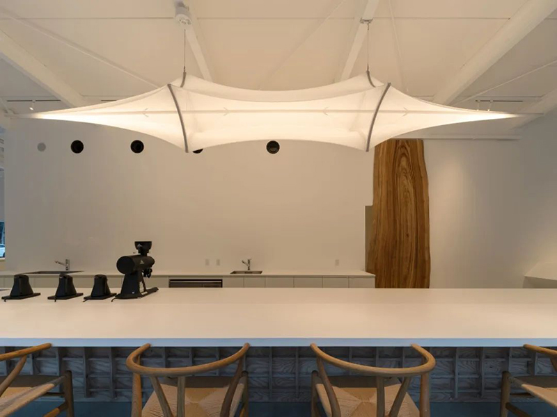 在這層帷幕之下,一個明亮的白色立方體空間映入眼簾。拋光石膏制成的柜臺仿佛懸浮于中央,其細膩的飾面與彈力織物燈具的柔和半透明質(zhì)感形成鮮明對比。光線與材質(zhì)的精妙平衡,營造出一種近乎失重的空靈氛圍,進一步強化了咖啡館的縹緲理念。